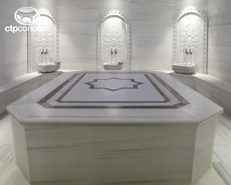 CTP KUBBE TAVAN – 44 Türk Hamamında kullanılan nem’e dayanıklı CTP Kubbe Tavan, Kubbe etrafında spot aydınlatma, Kubbe içerisinde Alüminyum kanallı epoksili rgb led aydınaltma ve fiberoptik aydınlatma uygulanmıştır.