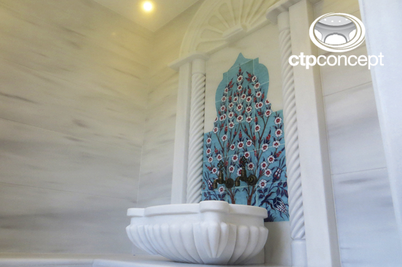 Türk Hamamında kullanılan nem’e dayanıklı CTP Kubbe Tavan, Kubbe etrafında spot aydınlatma, kubbe içerisinde epoksili led aydınlatma uygulanmıştır.