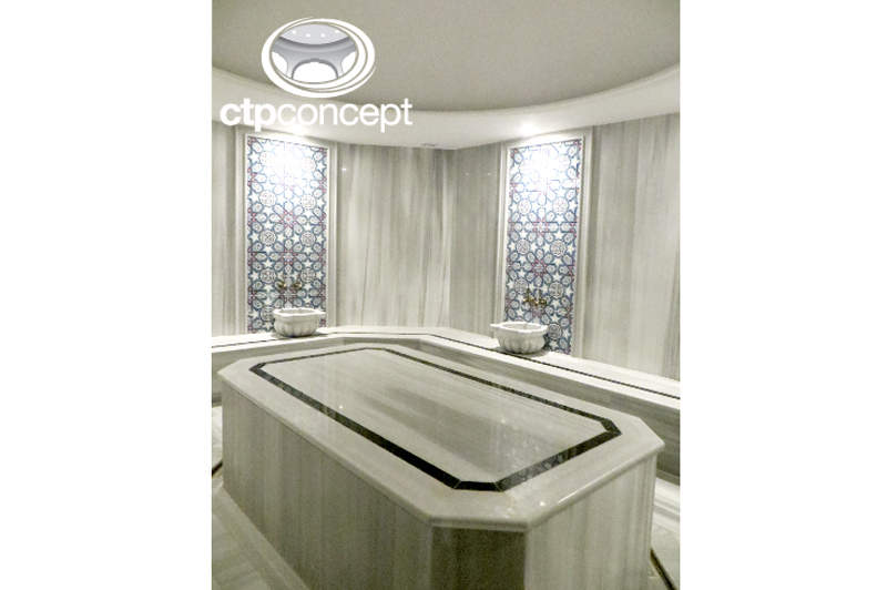 Türk Hamamında kullanılan nem’e dayanıklı CTP Kubbe Tavan, Kubbe etrafında spot aydınlatma, kubbe içerisinde led aydınlatma uygulanmıştır.