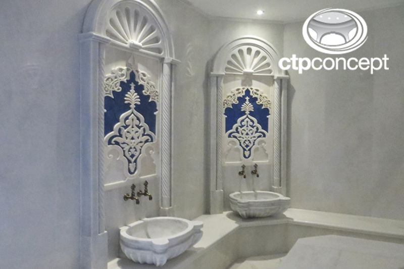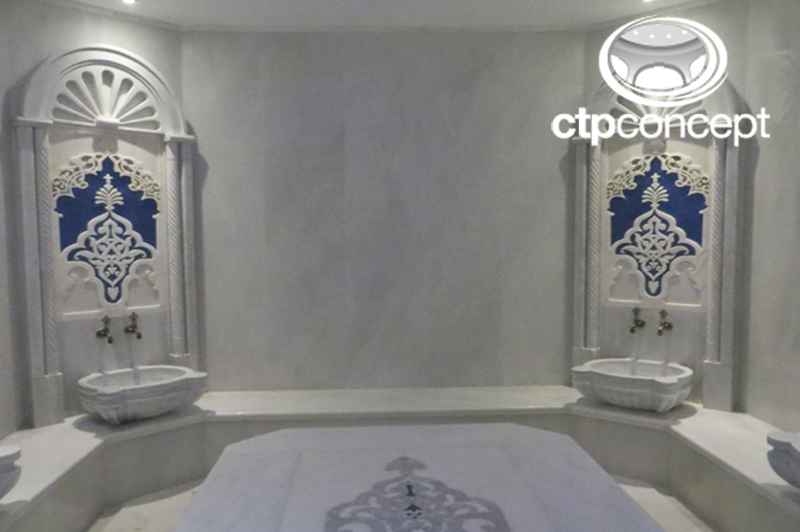 Türk Hamamı ve Kese Odası projesinde nem’e dayanıklı CTP KubbeTavan, tavan içerisinde RGB Fiberoptik aydınlatma ve etrafında spot aydınlatma, Buhar Odasında kullanılan nem’e dayanıklı özel ölçülerde CTP Tonoz Tavan, Tonoz içerisinde alüminyum kanallı epoksili led aydınlatma kullanılmıştır.