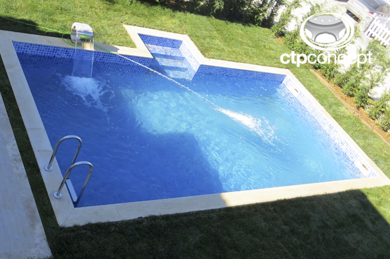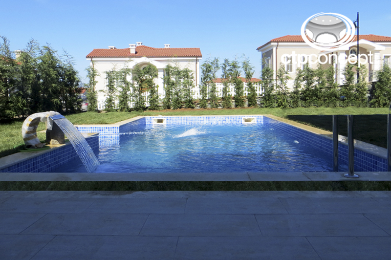 Yüzme havuzunu villa bahçesinde en uygun konumda ve ölçüde projelendirilmiştir. Mozaik kaplı, traverten tutamaklı, skimmerli ve dekoratif paslanmaz şelale gaga şeklinde uygulanmıştır.