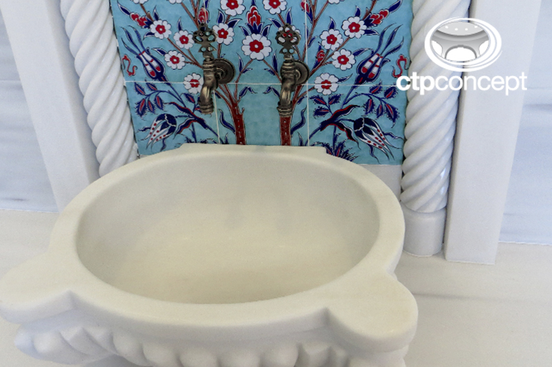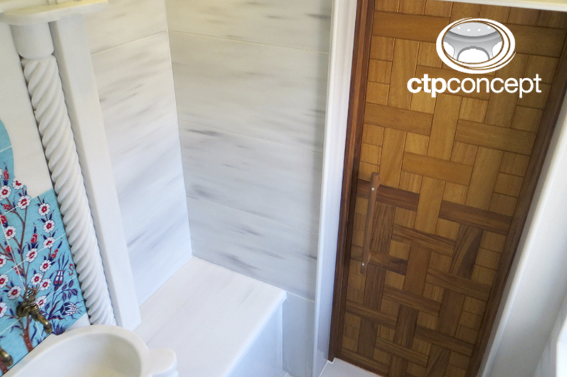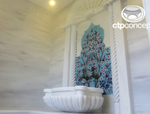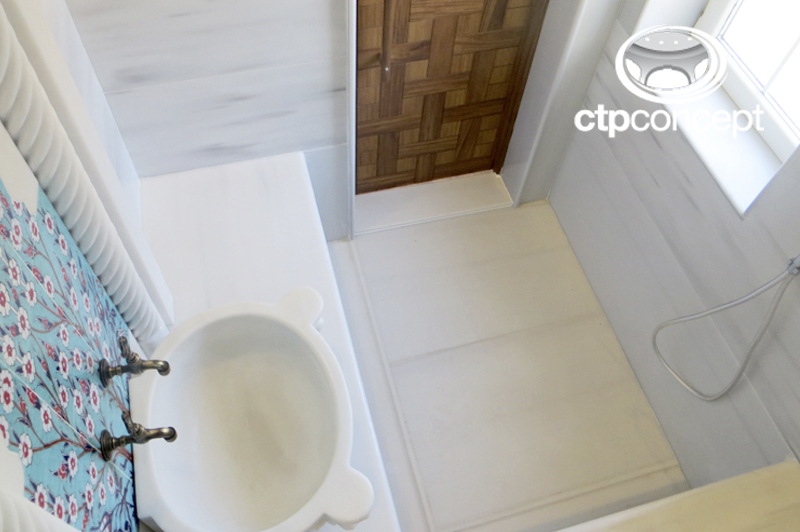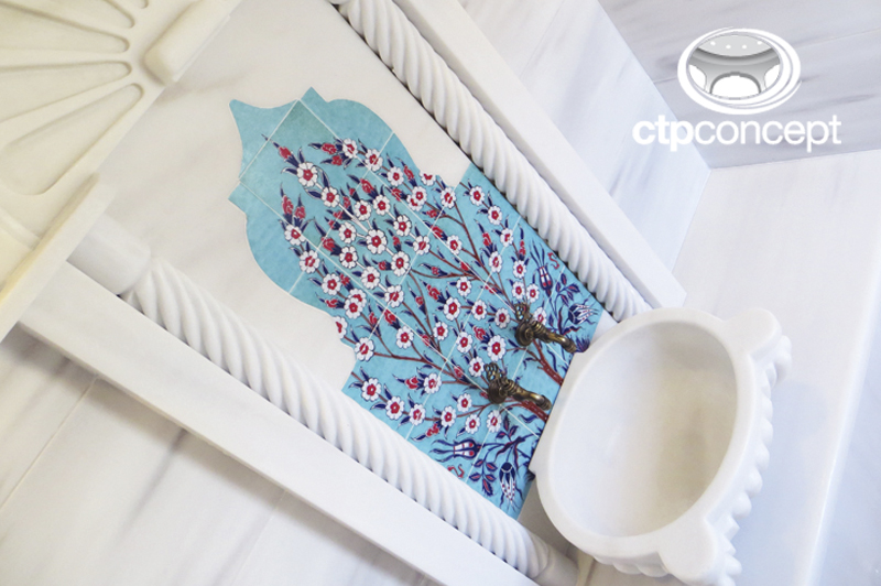 Türk hamamının oturma bankları, duvarları ve zemini beyaz marmara mermeri ile kaplanmıştır. Kurna olarak el işçiliği kavun dilimi model , pano olarak el yapımı özel desen çini ve mermer pano (söve) kullanılmıştır.